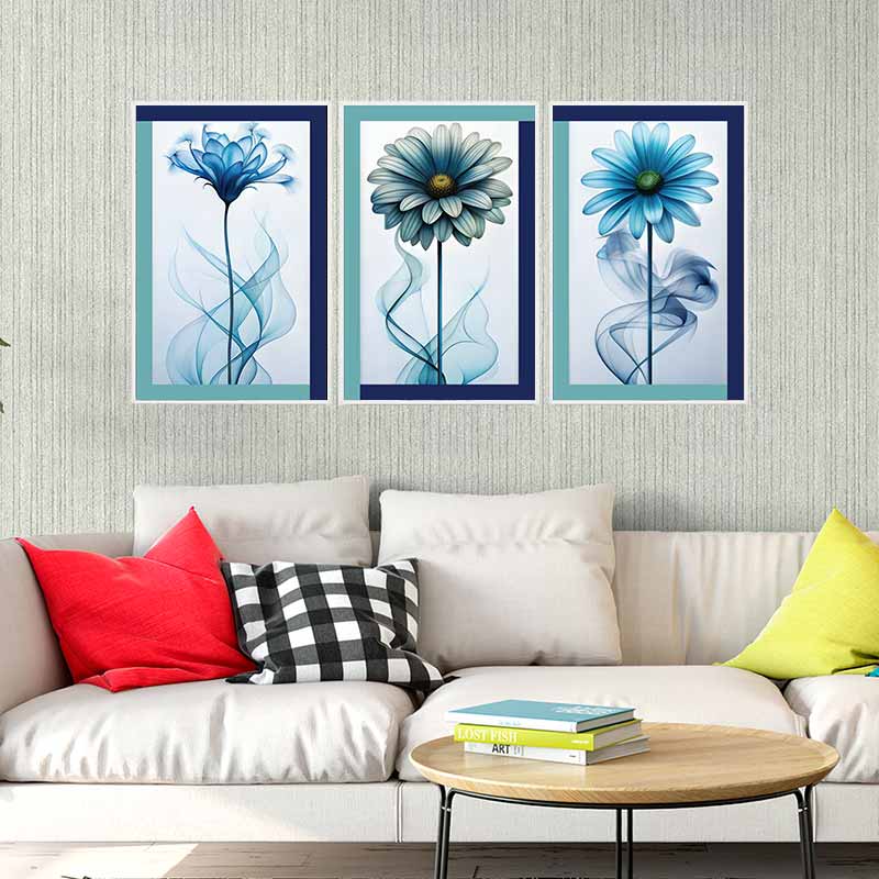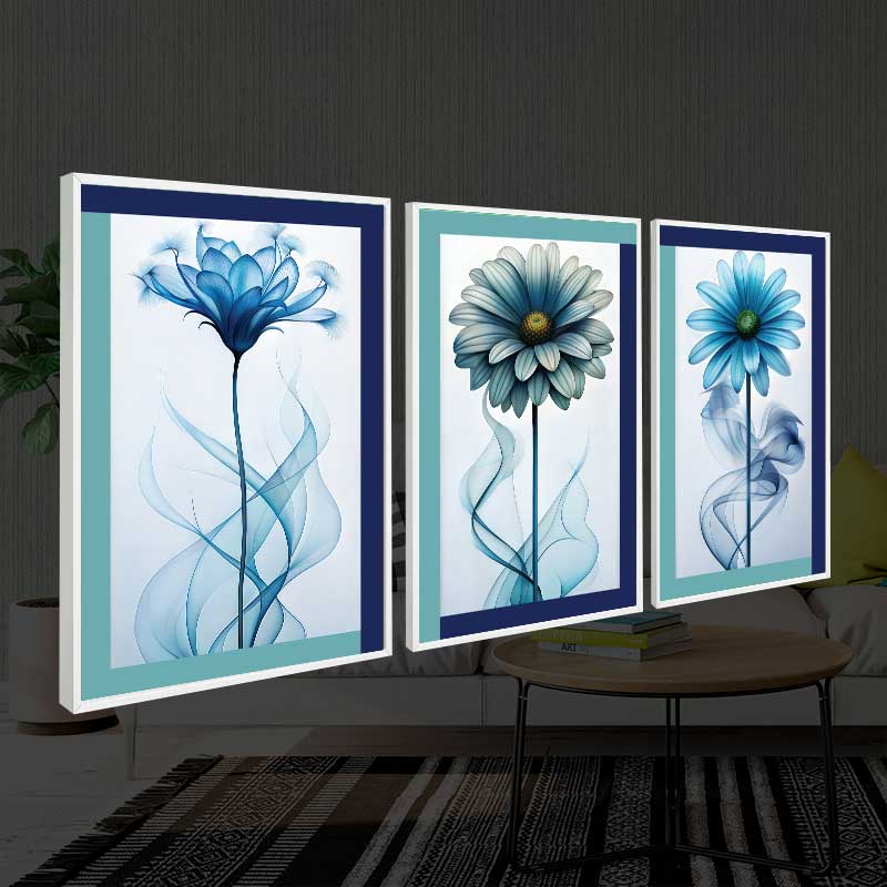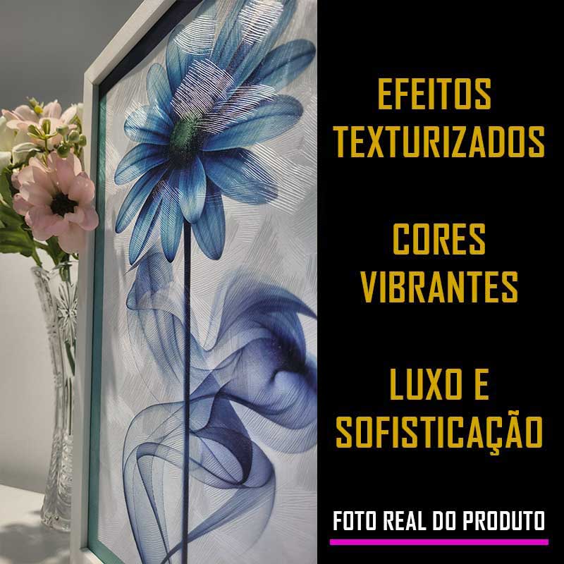 Transforme sua sala de estar em uma obra de arte com nosso Quadro floral Florescer Índigo - Edição Luxo Texturizado! mais do que um simples quadro, este trio é uma peça de arte que vai elevar o nível da sua decoração e impressionar seus convidados!